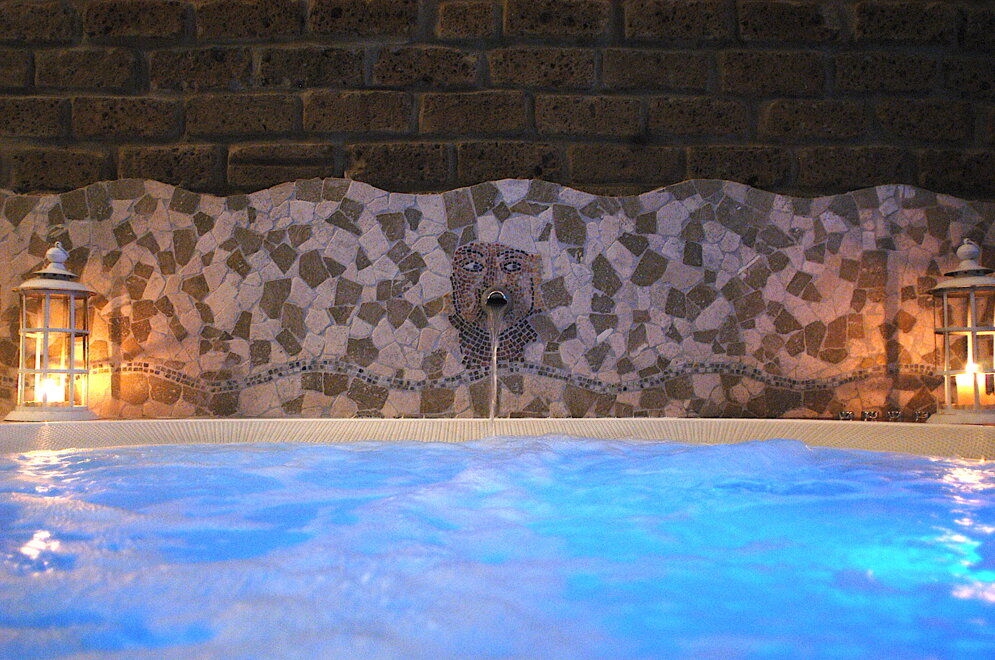 La vasca con 6 posti, circondata da mosaici, è dotata di cascata di acque minerali termali, cromoterapia e diversi idromassaggi per ogni parte del corpo. I colori ci fanno immaginare di essere nel mare in una serata di luna piena...